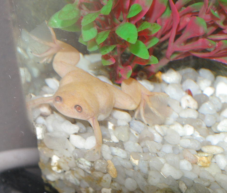 От 3 дена имам жабка албинос. Почти през чялото време се крие и в малкото пъти, в които излезе само ходи по дъното. Виждала съм как постоянно плуват, а тази мойта.. пълна противоположност.  *SORRY* *SORRY*