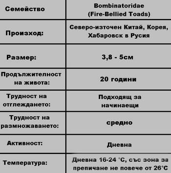•   Bombina Orientalis, Китайската или Ориенталската огненокоремна жаба е ярко зелена до тъмно маслнено кафява, с черни петна. Някои по-тъмни идивиди могат да имат и зелени петна. Долната страна на уловени диви екземпляри най-често са описва като червена с множество черни точки, докато при отглеждани в плен екземпляри тя най-често е оранжева. Това най-често се дължи на липса на пигментни молекули, които са се съдържали в предишната им хранителна диета.