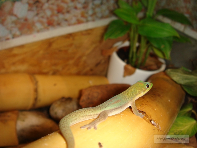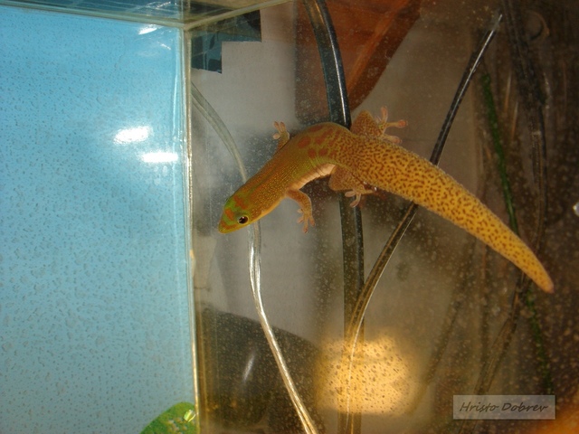 От три Гекота останаха два. Смених им къщата с по-голяма и единият цяла седмица беше в нелегалност като си мислих, че се укрива из терариума. Да, ама не. Измъкнал се по необясними начини нашия и обикаля апартамента. Тази вечер го пипнах по отражението и сянката му от лампата. Кацнал  на терариума отгоре и наднича вътре. Изтъняла му опашката  от глад. След половинчасова игра на котка и мишка го пипнах  и го прибрах вътре. Като се поуспокои, първата му работа бе да се напие като камила с вода а после залепна на фруктовото желе с витамини и протеини и близа до насита. Напоен и нахранен що годе се скри  из бамбуците доволен.