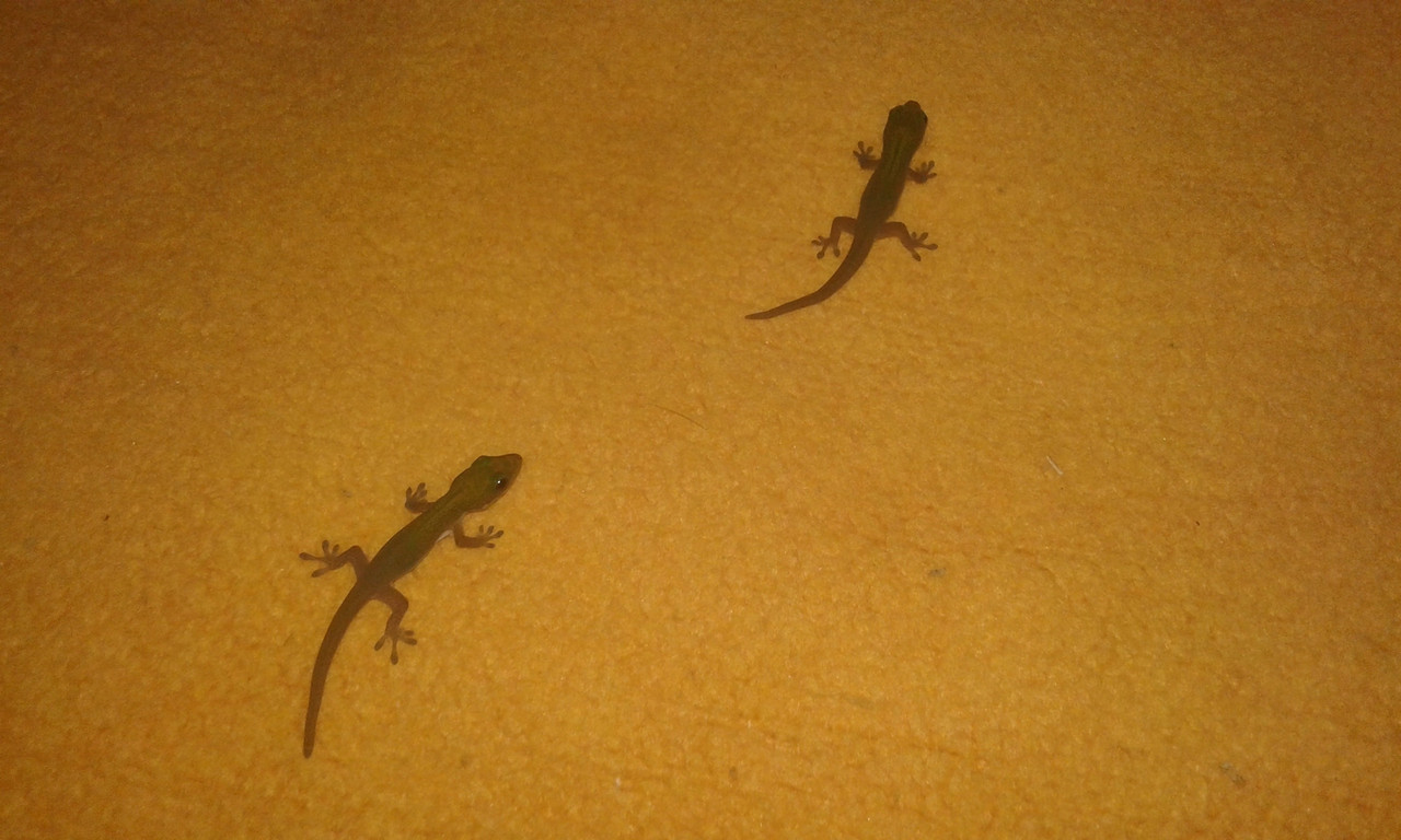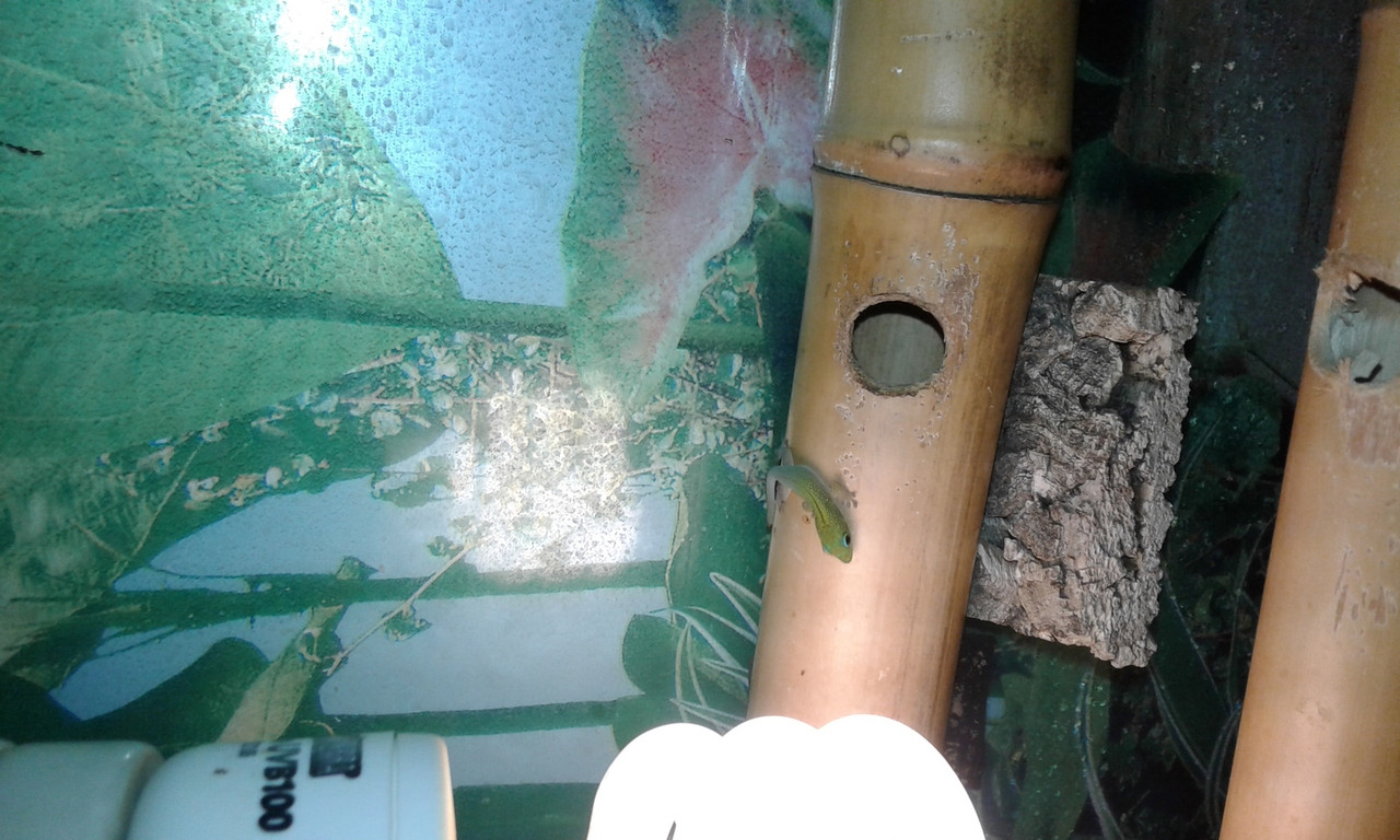 Видях го да се самозахранва с плодовото желе на капсули които съм оставил вътре. Днес пуснах и щурци та да има какво да хапват докато отново съм в отпуска.  Надявам се да оцелее. Доста е чевръст мъника и умело се крие като усети сянката ми. На родителите си се е метнал.