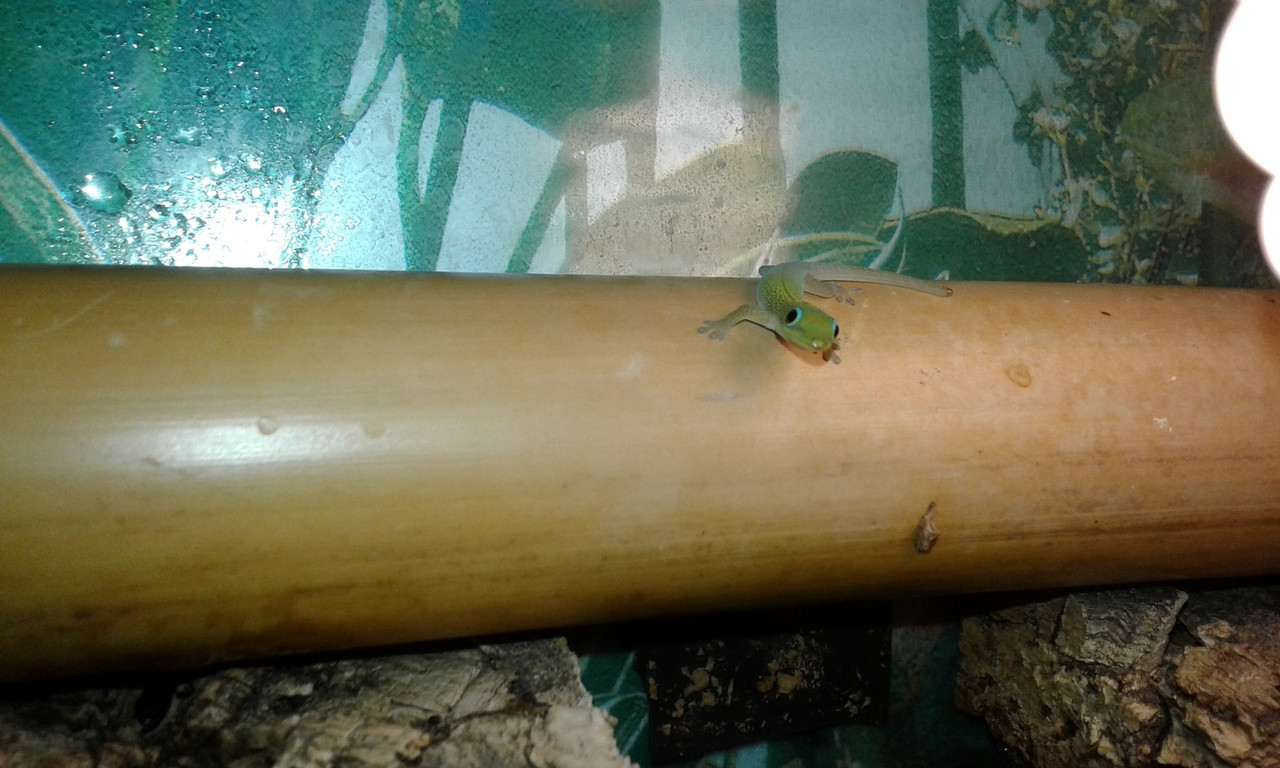 Такааа, днес след цял месец отсъствие и като се "освестих" от дългия път от 2000 км. допълвам обещаното за Гековците. Заварих ги в почти окаяно състояние  като водата в купичките се бе изпарила тотално. Големите бяха позаслабнали а малкият който видях беше като от Бухенвалд. Опашката му  навита на колелце като на хамелионите но нагоре и един гърчав та чах си помислих ще издаде багажа всеки момент. Започнах да пулверизирам на всеки 15-20 минути. Капсулите  бяха поизядени, засъхнали а имаше и такива с плесен. Смених естествено  и тях. При едно от пръсканията с пулверизатора забелязах втори мъник. Женската започнах да дебна и като "кацна" странично на стъклото видях, че яйцето в нея го няма. Обикновено са по две яйца но знам ли...тази явно си въди само по едно. Та така...вече сме четирима.  *YAHOO*