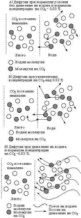 Водата съдържа 0.03% разтворен СО2 и няма насочен поток на водата. Растенията съдържат по-малко количесто. В тях количеството на СО2 намалява, защото се изразходва във фотосинтезата. Разтворения във водата СО2 се движи хаотично благодарение на топлинното движение, и вероятността посоката на движение да е към листта е малка.