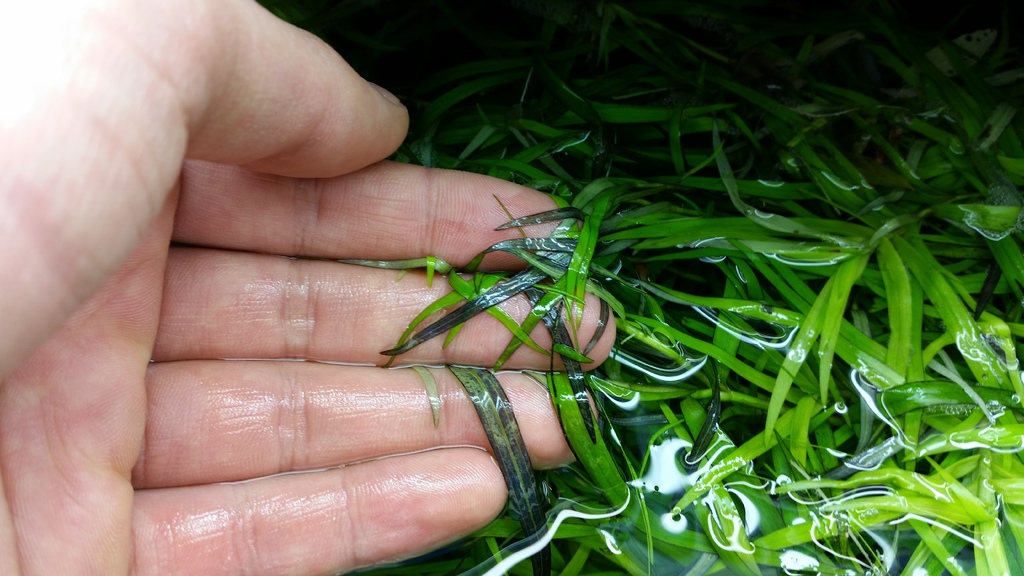 Първото е циано - "синьо зелено водорасли",  следващото липса или предозиране на калий , валиснерията така ми става като предозирам с желязо , ампулариите стават така от меката вода, като се пробие и малка дупчица умират. При мен изкараха 5-6 месеца и черупките им станаха така .. От 4 две умряха... От со2 като умекотява и ...