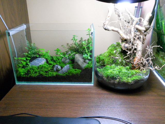 Е велик си  *privet* Аквариума е добър но тази купа е много красива  *THUMBS UP* Дай малко информация ако може примерно каква е почвата как процедираш с навлажняването. Аз от много време ми се ще да си направя подобно бижу на работа на бюрото. Но се чувствам не сигурен и за това не предприемам нищо. Точно днес си мислех какво стана със сухото ти творение и на  :-D Ама че съвпадение  :-)