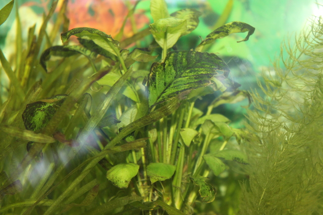 От около година имам аквариум 240 литра. От около месец имам проблем с растенията ми, които не вървят никак добре и не мога да разбера какво се обърка. То от началото на аквариума растенията ми не са много хубави, защото гледам дискуси и темп. на водата е 30 градуса. Не торя. Растенията ми са валиснерия и мисля че другото е анубиас. Но както казах от около месец нещата станаха доста по зле. Допреди това валиснерията се разрастваше на страни. На височина не иска и не мога да разбера защо. Сега вече спря и настрани. Анубиаса - листата му се разпадат. Стават жълти, кафяви и някои от тях имат и дупки. Дано от снимките които слагам да се вижда добре и които има някаква идея да я споделя моля Ви :).