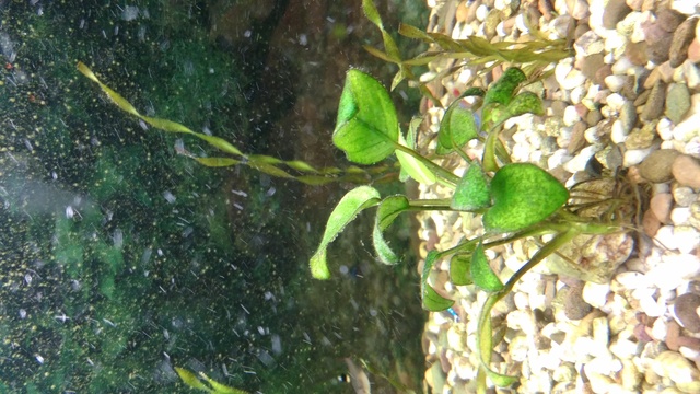 Проблемат е следния появиха ми се водорасли нишковидни и черна брада които почти ми умориха растенията сега овладях положението доло горе. Но повечето ми валиснерия почна да покафенява на скоро почнаха да ми излизат нови издънки по анубиаса се появиха тъмни точки на листата едното листо се изви и се счупи ще видите на снимките.Явно то ва не спира растежа защототo днес анубиаса пусна ново листо а другите растения потръгнаха доло горе но доста бавно растат.Роголистника също става кафяво оранжев и расте много бавно (в стария аквариум роголистника и валиснерията растяха като луди).Не подавам СО.