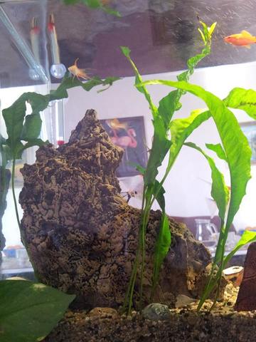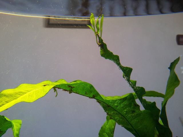 Ами то има съвсем малки корени и много големи листа, ако го оставя само да се хваща ще го разнася течението из целия аквариум :( и не съм го засадила много на дълбоко.. а листенцата кога да ги махам ?