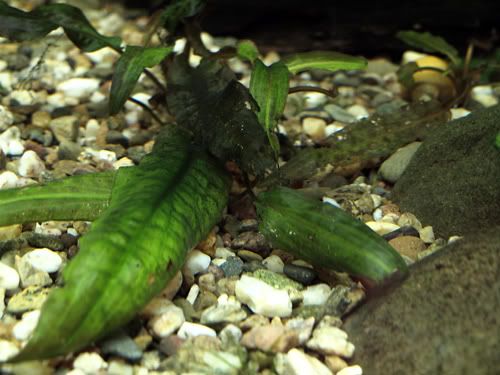Грунда е прекалено едър, има ли нещо под този камънак, криптокорината изисква богат субстрат, кога е стартиран аквариума и от колко време са засадени растенията, колко риби има, торове (освен Плантамин-а, който е само микроелементи), СО2? Пусни една цялостна снимка, ако имаш.