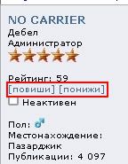 Ако рейтингът ви спадне с някоя и друга единица не го приемайте вътрешно - винаги се намира някой да натисне минуса. Дори да няма очевидна причина (писане на латиница, пусната тема в грешен раздел, кофти правопис, говорене на глупости), това не е края на света. Ако покажете, че сте разумен индивид, който е в състояние да води смислен и културен разговор, рейтингът няма да остане задълго отрицателен. Ако пък преведете или напишете някоя хубава и полезна статия или покажете яки снимки, ще хвръкне нагоре.