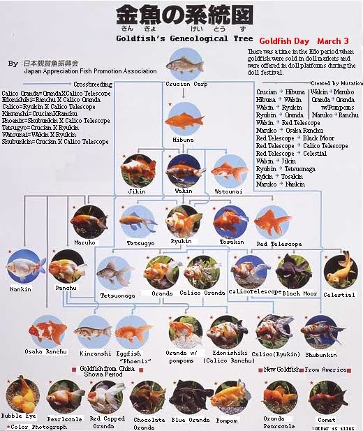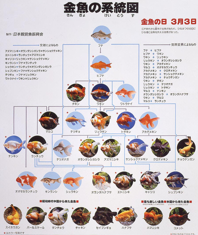 В тази схема са показани  Японските селекции на златните риби.  Родината на златните риби е Китай и някои от породите не са показани  тук.