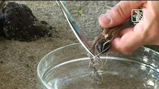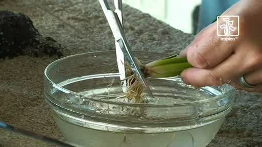 Разделете снопчетата растения на отделни екземпляри и сложете в плосък съд. Вземете съда (много е удобна ваничката за боя) в едната ръка, а пинсетата в другата. Хванете растението за корените, близо до мястото на растеж, и с дъгообразни движения го засадете в грунта на 1.5-2см. Отпуснете пинсетата и внимателно я извадете от грунта. Растението би трябвало да се задържи в субстрата.